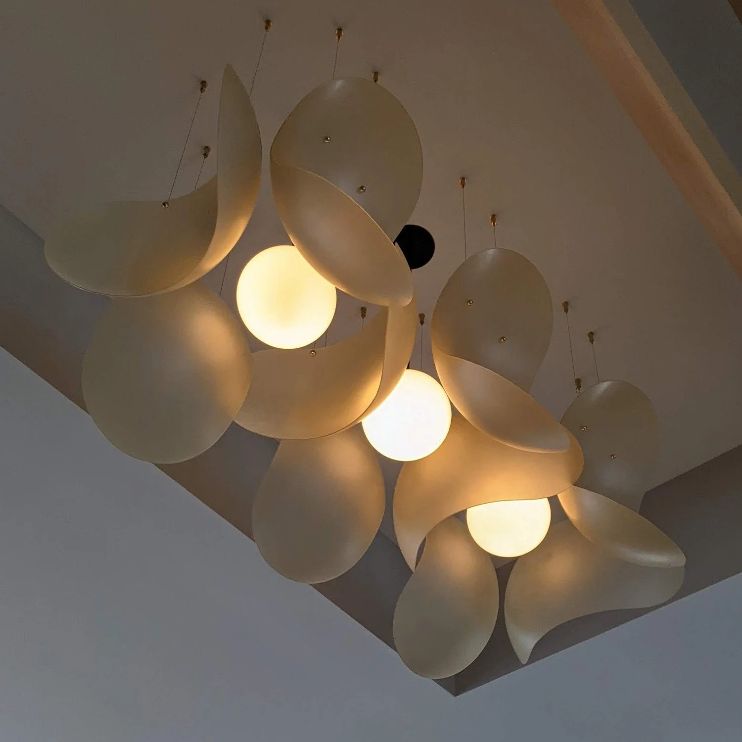 Votre designer vous fait découvrir notre portfolio, vous suggère de venir nous rencontrer au studio pour discuter de votre projet d’éclairage sur mesure, et voici le résultat : une création unique, fabriquée à partir d’objets récupérés.